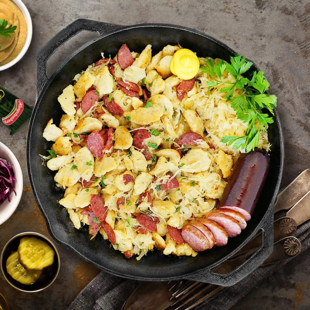 MENU: Mennonite theme: Farmer sausage, Spaetzle (German egg noodle), mushroom gravy, salad